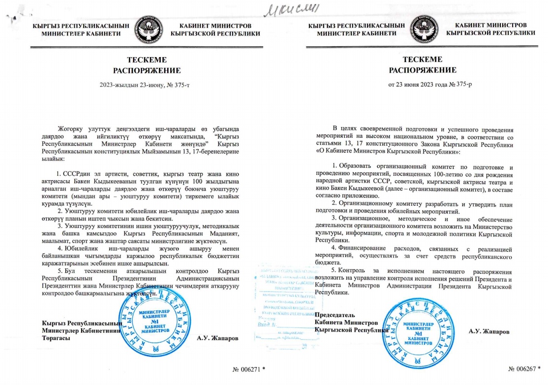 Решением совместного заседания министров культуры Азербайджана, Казахстана, Кыргызстана, Узбекистана, Туркменистана, а также представителей Парламентской ассамблеи тюркоязычных государств на очередном заседании Постоянного совета ТЮРКСОЙ в г. Бурсе (Турция) было принято решение о праздновании в 2023 г. 100-летия советской и кыргызской актрисы театра и кино Бакен Кыдыкеевой.